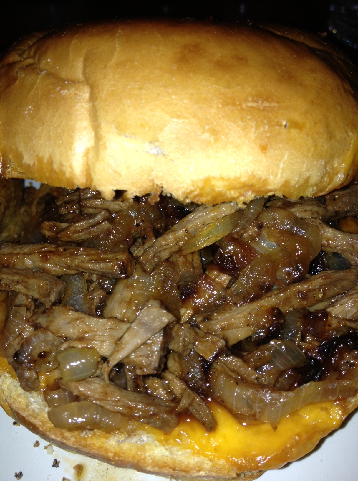When the cheese has melted, add a spoonful of the steak on the bottom bun and top with caramelized onions and the other half of the bun.
