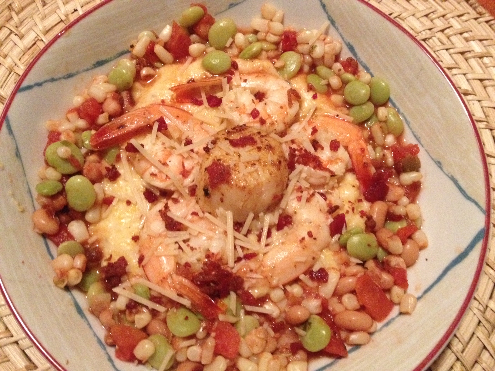 Serve over grits and succotash and top with Parmesan cheese and crumbled bacon if desired.